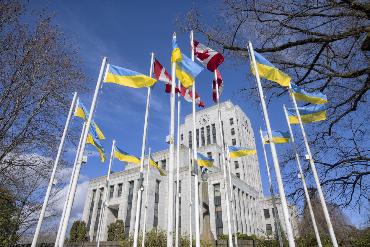 April 9, 2022, Ukrainian Flags and Canadian Flags waving in front of City Hall, Vancouver, Canada