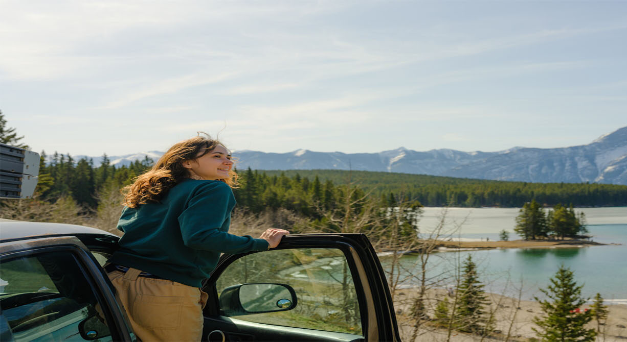 Woman looking at scenic lake along the road in Banff during road trip with SUV in springtime