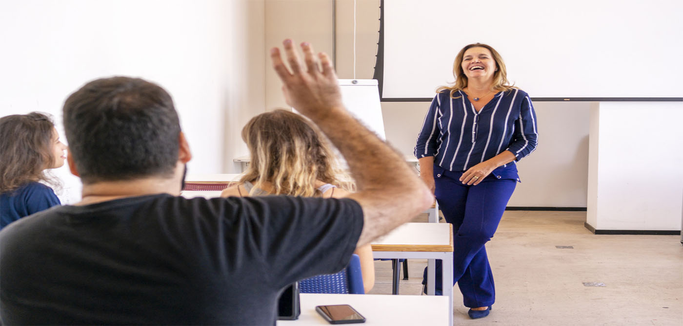Photo of a group of students and a teacher in a classroom.